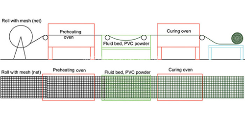 Process Flow of Wire Mesh Electrostatic Fluidized Bed Coating line: Manual feeding - Pre-heating - Auto powder immersion - Curing - Cool the coated mesh - Manual discharging - Manual shaping correction - Quality control - Final package